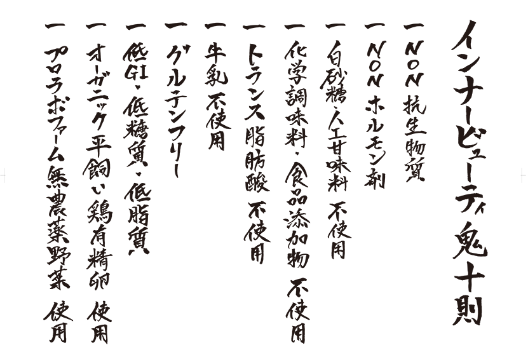 本店是全球首家以不在?;蜇i飼料中添加抗生素或激素,提供安全健康的肉類料理為基本理念的內(nèi)在美容肉類割烹料理店。不添加白砂糖、不含農(nóng)藥、不含麩質(zhì)、不添加反式脂肪酸、不添加牛奶……本店致力于通過精心挑選的食材來改善人們的飲食習(xí)慣,并為延長人類的健康壽命做出貢獻(xiàn)。